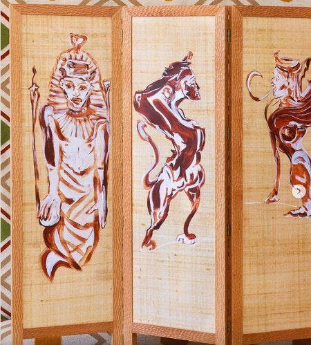 Si le site saoudien s'enflamme particulièrement pour sa ligne de mobilier Ménès —du nom du Pharaon qui aurait uni Basse et Haute Égypte en un seul royaume—, j'avoue plutôt craquer pour ce paravent, présenté en fin d'article, conçu avec la peintre Lola Montes Schnabel et inspiré d'un conte de l'écrivaine et journaliste Yasmine El-Rashidi.