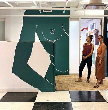 Avec un twist : les corps féminins représentés, réduits à de simples sections, à des détails, enfin bref, disons-le, à des morceaux, sont à la fois dessinés "à la Matisse", mais aussi, à leur tour, eux-mêmes scindés en éclats, en brisures, en bouts. "La multiplicité des images reproduit l'expérience contemporaine, voyeuse, qui exhibe à outrance, sans honte, la vie privée des corps, pour faire du commerce ou de la communication", écrit Whitehot Magazine. "Dans les œuvres de Badrichani, il n'y a pas de visages, pas d'identité. L'artiste utilise des parties anonymes de formes tout à fait reconnaissables, propres aux Nus que nous nous envoyons par sexto, ou que nous accumulons sur nos téléphones."