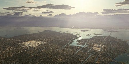 On découvre une cité fascinante. Bâtie sur un lac gigantesque, et bâtie rationnellement —"L'organisation en grille est le reflet d'une ville fondée sur le principe de hiérarchie. Les quartiers sont planifiés, chacun étant doté de son propre marché, de ses écoles, de ses lieux de culte. Les canaux sont entretenus régulièrement, pour assurer le transport des humains comme des marchandises. Une série de ponts relie le tout."