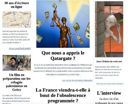 Et sur le Fil PostAp : les leçons européennes du Qatargate, l’histoire de l’écriture en ligne, un projet de film sur les réfugiés climatiques en Grèce, une nouvelle émission sur la stratégie internationale, l’interview d’un trafiquant de sex-tapes, et le portrait d’une activiste française qui veut la peau de l’obsolescence programmée.