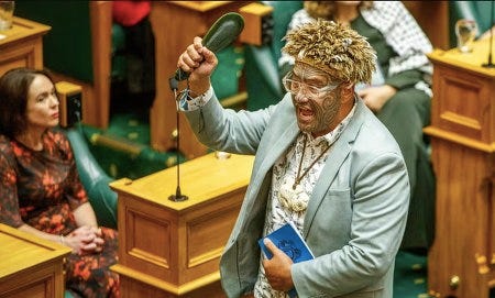 Pendant ce temps, dehors, des milliers de Maoris manifestaient leur opposition aux projets du nouveau gouvernement conservateur, décidé à revenir sur 50 ans de reconnaissance et d'autonomie de ce peuple millénaire. Notamment en interdisant l'usage de la langue indigène dans l'administration, et en supprimant leur agence de santé dédiée.