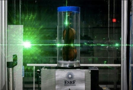 Le voici pourtant en excursion afin d'être scanné en très haute précision et en trois dimensions dans l'un des 15 synchrotrons (un type particulier d'accélérateur de particules) du monde. Le but de l'opération est de le cartographier au micron près, autant pour percer le mystère de son son que pour préparer au mieux d'éventuelles futures restaurations. Un traitement royal, pas réservé au premier do dièse venu :