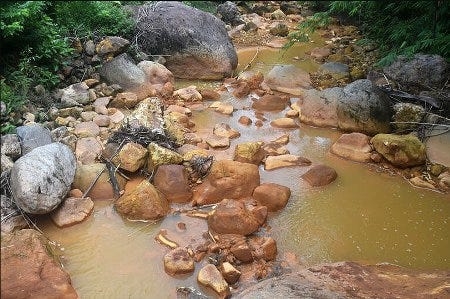 Cette couleur jaune serait-elle due à la mine de cuivre qui s'est installée en amont quelques années plus tôt ? L'enquête complexe va nécessiter des efforts considé… Ah non, non non, non pas du tout : les preuves de la responsabilité de l'entreprise Gemilang Limpah Internusa (GLI) sont aussi nombreuses que les escrocs autour du lit de Liliane Bettencourt le jour de ses 90 ans.