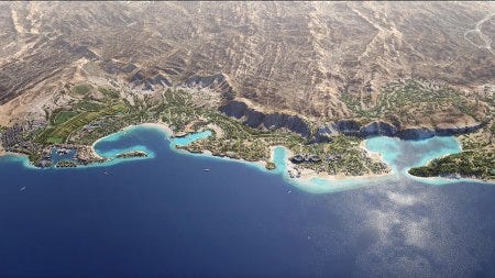 En réalité, il s'agit surtout de contribuer à l'industrie du tourisme de luxe du royaume, en créant 3 destinations écolos et franchement paradisiaques (esthétiquement, hein, je ne parle pas de l'ambiance). Il y a un premier emplacement sur la côte ouest de la Péninsule, en bordure de la Mer Rouge, "l'un des derniers trésors cachés, entouré par la quatrième plus grande barrière de corail au monde, qui s'étend en un archipel de 90 îles inhabitées, comprenant plages virginales, volcans éteints, plaines de dunes, canyons et sites historiques"… Il y a Amaala (Photo), "destination exquise […] par laquelle nous voulons ouvrir les yeux du monde à la beauté du Royaume"… Il y a "la retraite privée de Thuwal", "votre sanctuaire exclusif de la Mer Rouge"…