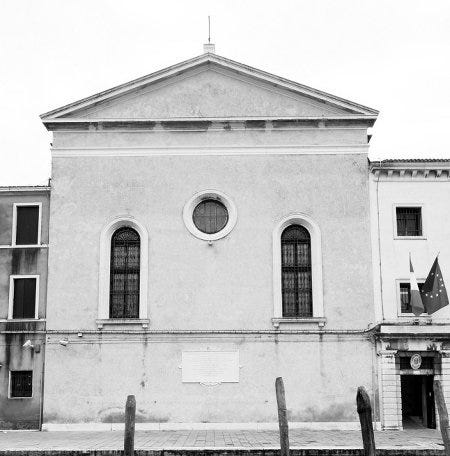 Cette façade austère comme une porte de prison est, justement, une façade de prison. En l'espèce, la prison pour femmes de la Guidecca, installée dans un ancien couvent de Venise.