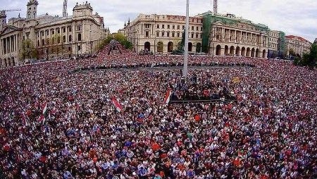 "À partir de 15 heures, la place iconique en face du Parlement était remplie, et la foule débordait dans les rues adjacentes. Beaucoup arboraient des drapeaux rouge, blanc et vert, qui rappelaient aux observateurs l'apparence des rassemblements du Fidesz. Mais les analystes ont remarqué avec justesse qu'il s'agissait plutôt d'une tentative revendiquée de se reprendre en main les symboles que s'est approprié le parti au pouvoir.