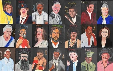 Si j'ai fini par faire la connaissance de cette femme formidable, c'est avant tout grâce à elle-même, à son manque d'autodérision. Elle a en effet récemment contacté la National Gallery of Australia pour tenter de faire retirer une peinture de l'exposition en cours, "Australia in colour", dédiée au travail de l'artiste aborigène Vincent Namatijira. Celui-ci s'est spécialisé dans l'ironie, aimant à représenter les puissants de son pays tels qu'ils sont, c'est-à-dire en clowns vulgaires et difformes. Un peu comme si le portrait de Dorian Gray en faisait ressortir le ridicule plutôt que la cruauté abyssale (ce qu'il aurait vraisemblablement moins supporté encore). Sur l'image choisie en illustration ci-dessus, vous pourrez par exemple reconnaître divers champions sportifs ou politiciens locaux mais aussi (sur la première ligne, en quatrième position) le Prince Charles ou, en-dessous, la Reine Elizabeth… Gina, c'est la grosse chaperonne rougeaude sise en troisième position sur la ligne centrale. On peut aussi y voir Jimi Hendrix qui, lui, s'en sort plutôt bien. Explications de l'auteur :