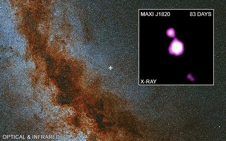 Mais commençons par les présentations : MAXI J1820+070 (mais je vais l'appeler "Bob") est un système binaire, constitué d'un trou noir ("Bobby") et, pour sa malchance, d'une étoile ("Jean-Patrick"), situé à environ 10 000 années-lumière de la Terre. Au cours de sa longue existence, Bobby a trop mangé : il pèse environ 8 fois la masse de notre soleil. Sa gravité est telle qu'il arrache son étoile voisine la matière qui la compose, à la vitesse prodigieuse de 80 % de celle de la lumière. Vous connaissez la suite de l'histoire : le mélange de plasma et de gaz ionisé se met alors en orbite autour de Bobby, constituant un disque d'accrétion (la seule trace visible d'un trou noir, parfaitement reproduite par les équipes de Christopher Nolan dans Interstellar).