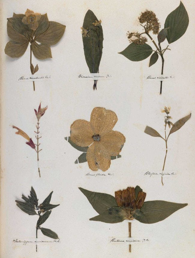 Il cite aussi en détail Emily Dickinson, dont une page de l’herbier figure ici en photo, et dont il souligne la clairvoyance : “La façon dont Dickinson perçoit la flore efface la frontière entre l’humain et les plantes, en faisant de la sensibilité un trait de caractère qu’elle partage avec la nature, bien plus qu’un regard esthétique porté sur le monde.”