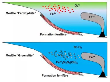C'était donc assez clair… Mais voilà : "à la suite d'études pétrographiques récentes, un modèle alternatif est apparu dans la littérature avec plutôt la précipitation primaire d'un silicate ferreux (Fe2+) tel que la greenalite."