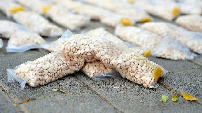 Vous savez peut-être déjà que la Syrie s'est imposée ces dernières années comme une nation tirant profit du Captagon, une drogue obtenue en combinant une amphétamine et un alcaloïde psychostimulant, la théophylline. Cette petite douceur a beaucoup fait parler d'elle ces dernières années, d'abord pour avoir aidé, à sa manière, les djihadistes de l'État Islamique à égarer leur jugement et à chasser leur fatigue, mais aussi, plus récemment, la Syrie à se maintenir debout économiquement, malgré la guerre civile qui la déchire encore et toujours : de l'avis de tous les observateurs, le pays est littéralement devenu un narco-État. Comme d'autres contrées vivent d'une rente pétrolière, la Syrie prospère en produisant, et en distribuant, cette drogue addictive et premier prix.