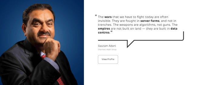 Cet homme, c'est Gautam Adani, président et fondateur du conglomérat du même nom, lequel fait dans les ports, les infrastructures industrielles et l'achat-vente de matières premières. Avec une fortune personnelle de plus de 130 milliards de dollars en 2022, il était alors l'homme le plus riche d'Asie, et la troisième plus grande fortune mondiale.